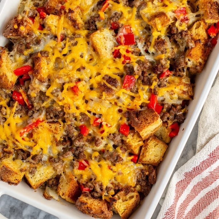 - Spread your bread cubes evenly in a buttered 9x13 inch baking dish, then scatter the cooked sausage mixture on top. This ensures every serving gets plenty of meat and those crispy edges everyone fights over.