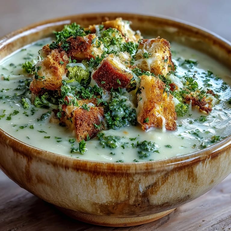 - Ladle the soup into bowls and crown each one with your golden croutons, fresh parsley, and a sprinkle of Parmesan if you're using it. The warm soup and crunchy croutons together create this textural moment that makes the whole thing feel special.