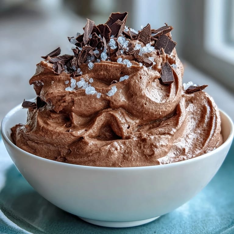 This Fluffy Yogurt Protein Mousse shines as an elegant dessert when served in clear glasses or bowls, showcasing its silky texture and beautiful toppings. Layer it parfait-style with granola and fresh berries for a protein-packed breakfast or snack. The flaky sea salt topping is essential—it provides textural contrast and enhances the chocolate flavor in a way that feels restaurant-quality. Fresh raspberries, strawberries, or blueberries add bright, tart notes that complement the rich cocoa beautifully. For special occasions, serve alongside a small glass of ruby port or a shot of bold espresso to create a complete dessert experience. The mousse also works wonderfully as a filling for crepes or as a topping for angel food cake. If entertaining, set up a topping bar with various options like crushed nuts, coconut flakes, cacao nibs, and different berries, allowing guests to customize their servings.