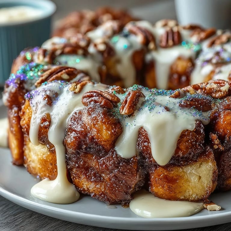 Pin it There's something about the weeks leading up to Mardi Gras that makes me want to bake something loud and celebratory, and this King Cake monkey bread landed in my kitchen on one of those restless mornings when I couldn't decide between breakfast and dessert. I'd been scrolling through old photos of New Orleans street celebrations when the idea struck—why not combine the purple, green, and gold festiveness of the season with the pure joy of pulling apart warm, buttery bread? The first time I made it, my kitchen filled with cinnamon-sugar dust, and by the time the icing hit the warm bread, my whole apartment smelled like a bakery having a party.