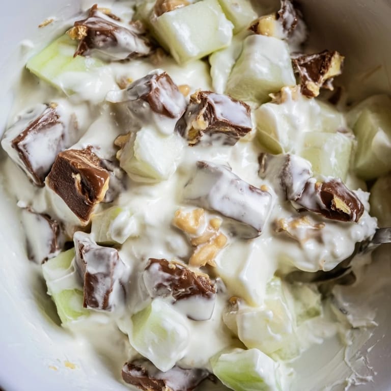 Pin it The first time I brought this to a church potluck, I watched three different people ask the host for the recipe before they even finished their first serving. My grandmother called it a salad because it has fruit, but we all know better. Theres something magical about the way tart crisp apples cut through that sweet creamy pudding, while chopped Snickers add this salty chocolate crunch that makes it impossible to stop eating just one bowl.